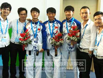 跆拳道品勢賽韓國奪三金 冠亞軍與首腦造型師合影