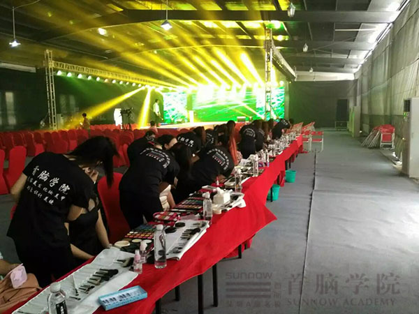 化妝現(xiàn)場,首腦學院的化妝師們面對如此盛大的場面毫不怯場,淡定自若,將在學院所學的化妝知識巧妙的運用在實踐中,力傾為亞姐打造完美妝容!