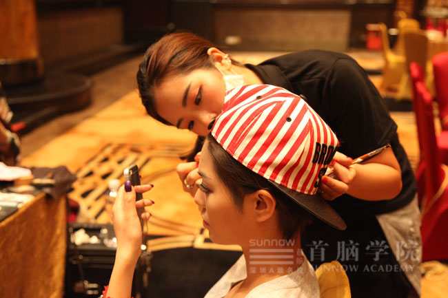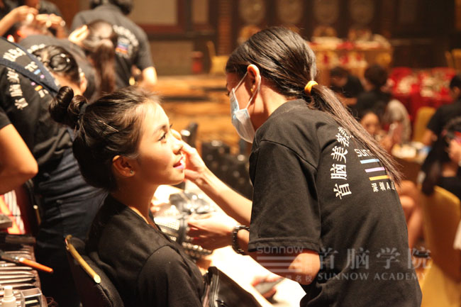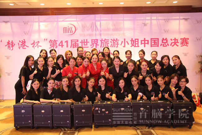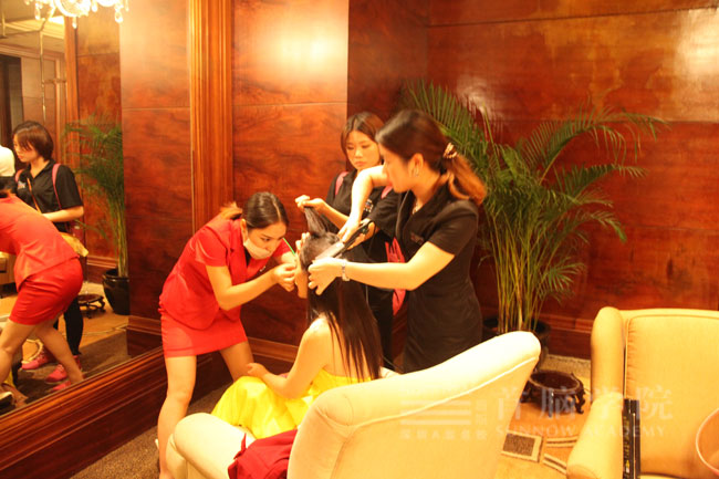 首腦學(xué)院作為世界旅游小姐大賽唯一指定的化妝造型機(jī)構(gòu),特派出了一批優(yōu)秀化妝造型師團(tuán)隊(duì),這支隊(duì)伍由首腦學(xué)院羅湖校區(qū)的段麗、楊傳英、賈珍珠、張欣和沙井校區(qū)朱寧?kù)o老師帶隊(duì),所有的化妝造型師全力以赴地為大賽的佳麗們化妝造型,讓佳麗們?cè)谖枧_(tái)上更加美麗更加自信的展示自己。首腦化妝造型團(tuán)隊(duì)除了要幫佳麗們化妝和造型外,還要為現(xiàn)場(chǎng)的節(jié)目主持人等進(jìn)行化妝造型。