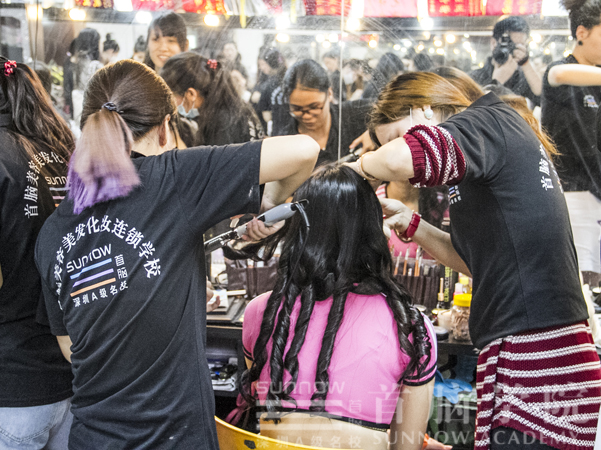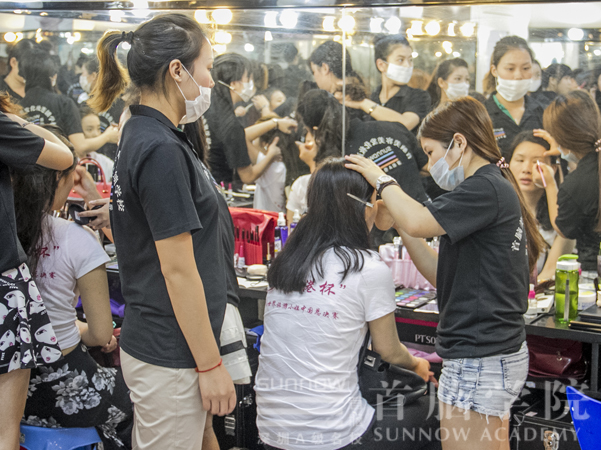 與以往一樣,每一次的活動前,我們的化妝師們都會事先做好準備,了解整個流程,根據(jù)佳麗們的需要等,做到胸有成竹,不留一絲缺陷,為佳麗打造完美的造型。這次為佳麗們打造的是“足球?qū)氊?rdquo;的造型,由于事先就有做好準備,所以化妝師們做起造型來是得心應手,動作非常嫻熟,整個化妝造型過程中,首腦學院南山校區(qū)的化妝師們都表現(xiàn)的非常出色。