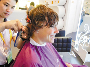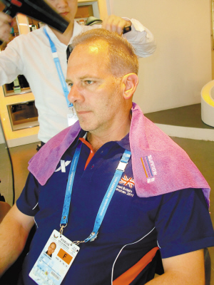 陶馬什·費埃爾是英國舉重隊的教練,一進門就問工作人員他國家的中文怎么說,由于漢語學習中心就在美發(fā)沙龍隔壁,因此記者還以為他走錯門了。原來他真是剛從隔壁出來,正好看到這里有美發(fā)沙龍就進來試試,順便繼續(xù)溫習下剛剛學過的中文。