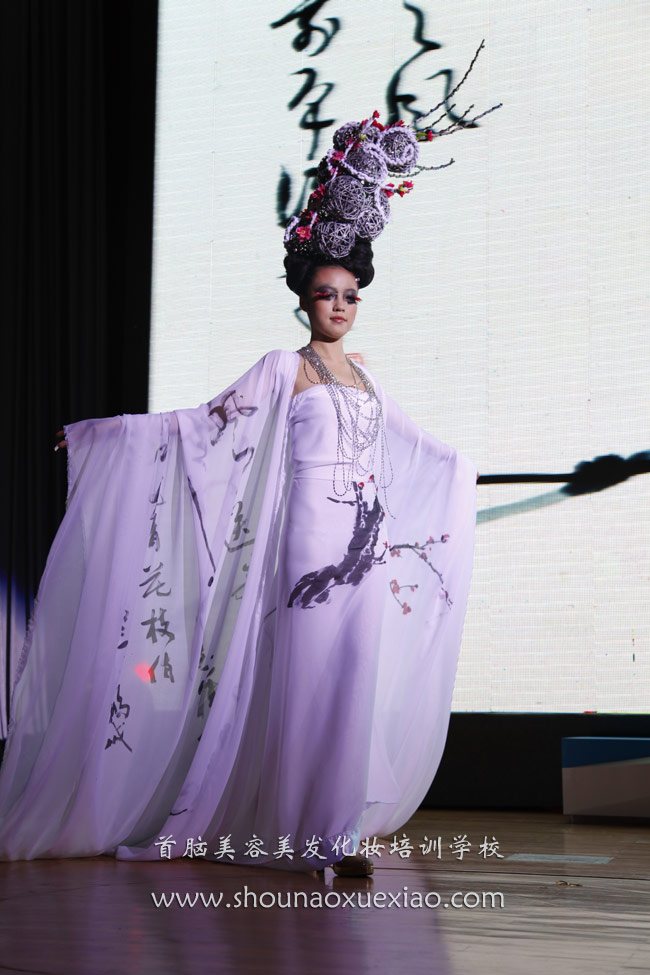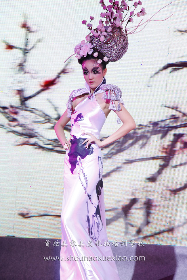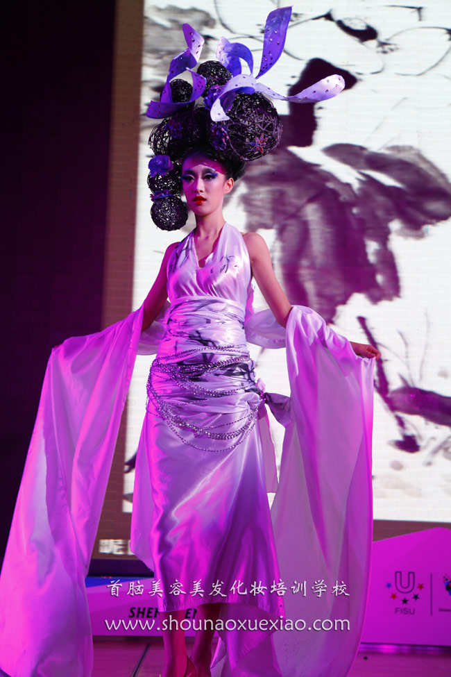 儀式上,各位領(lǐng)導(dǎo)從不同的角度表達(dá)了對(duì)大賽的祝愿和期盼,在最后,由首腦美容美發(fā)化妝學(xué)校的師生為大賽獻(xiàn)上一場(chǎng)美輪美奐的造型秀。在使人陶醉的音樂(lè)聲中,一組中國(guó)水墨畫(huà)題材的造型款款走上舞臺(tái),水墨梅花的“舞梅弄清影,歌聲月黃昏”意境讓人流連忘返。水墨荷花的搖曳生姿,紅黑相間的神態(tài),水墨菊花和水墨竹子的天然淡定,清心自賞的精神,都給人留下深刻的印象,把中國(guó)元素發(fā)揮的淋漓盡致。隨后出現(xiàn)的紅黃藍(lán)綠四個(gè)造型出場(chǎng),青春亮麗的大運(yùn)色彩上,舞動(dòng)著中國(guó)書(shū)法,像舞蹈一樣的書(shū)法,給人以極強(qiáng)的動(dòng)感,暗含著對(duì)大運(yùn)的無(wú)限憧憬。而模特們出色的表演,更把氣氛推向高潮。