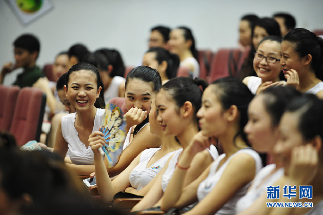 4月30日,女選手們在等待入場。當(dāng)日,深圳第26屆世界大學(xué)生夏季運動會頒獎儀式禮儀志愿者全國總決選暨誓師大會在深圳大學(xué)城北大研究生院舉行。350名選手在總決選中勝出,其中包括290名女選手和60名男選手,他們將于7月1日起接受封閉式集中專業(yè)培訓(xùn),并將承擔(dān)大運會賽時的306場頒獎任務(wù)。新華社記者梁旭攝