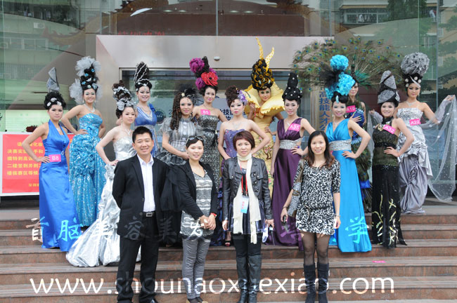 首腦老師班學員梁玲玲和美容老師茍璐與其她們的模特作品合影