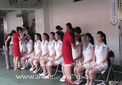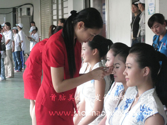 (首腦學(xué)?;瘖y師胡卉為禮儀小姐化妝)