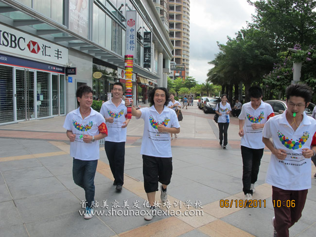 今天,首腦學(xué)校全體師生全部統(tǒng)一著裝大運(yùn)文化衫,此次火炬起點(diǎn)由京基百納廣場(chǎng)的首腦美發(fā)沙龍傳遞到首腦美容美發(fā)南山校區(qū),途經(jīng)沙河?xùn)|路到中海深圳灣畔花園,再經(jīng)沙河?xùn)|路,到達(dá)沙河集團(tuán)。首腦學(xué)校常務(wù)校長(zhǎng)茍韙韙由京基百納廣場(chǎng)接力第一棒,在四名火炬護(hù)衛(wèi)手的保護(hù)下跑步前進(jìn),途徑沙河?xùn)|路,由首腦學(xué)校師生接力跑完全程。一路上他們攝影、錄像與火炬手合影,備受路上行人關(guān)注,形成一道美麗的風(fēng)景線。