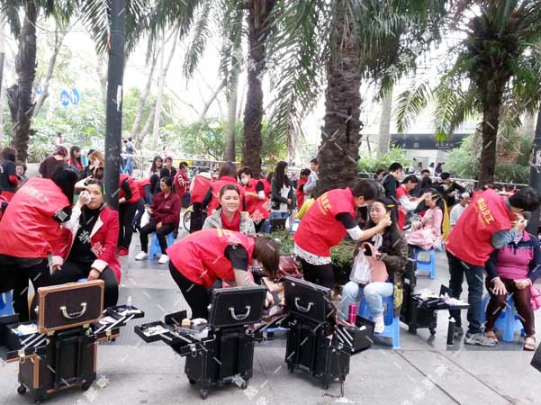 此次義工服務(wù)活動的地點(diǎn)是南山區(qū)白石洲灣畔百貨廣場,由學(xué)院師生組成的一支義工隊(duì)來到活動現(xiàn)場,依次排開,擺放好化妝、盤發(fā)、剪發(fā)等工具,這一熱鬧的場景吸引了不少來往的行人,以及附近小區(qū)的居民,學(xué)員們在老師的指導(dǎo)下,認(rèn)真細(xì)心的為市民們剪發(fā)、盤發(fā)、化妝、修眉?;顒映掷m(xù)了一下午,現(xiàn)場熱鬧非凡,首腦學(xué)院的老師與學(xué)員們,用他們精湛的技術(shù)、熱情的服務(wù)贏來市民們的聲聲贊美。