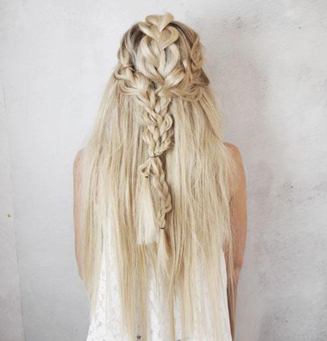 Step 4:接著魚骨辮剩下的頭發(fā)開始編三股辮至發(fā)尾,然后用小皮筋把三股辮綁好。