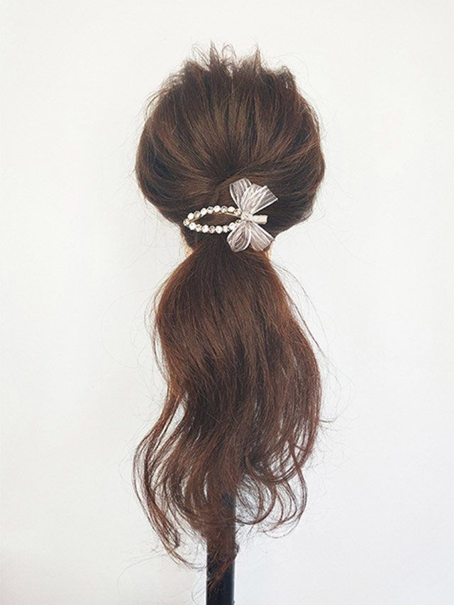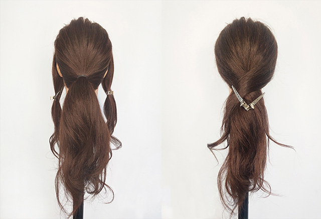 Fourth steps:交叉后的發(fā)束在馬尾下方用鋼絲夾固定好。