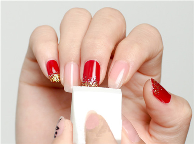 Second steps:用白海綿沾取金色亮片的指甲油涂在中指、小拇指以及大拇指的指尖。