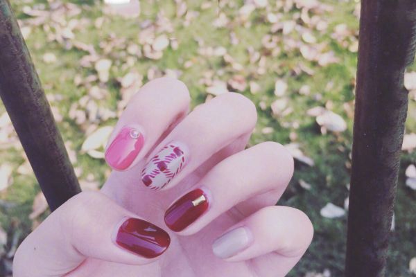5、這款美甲在陽光下超級美膩,有光澤感的豆沙紅十分靚麗,加上小面積的格子紅讓風(fēng)格變得有些許復(fù)古,總之純正的色調(diào)十分適合小巧的甲面,讓甲面具有視覺上延伸的效果。