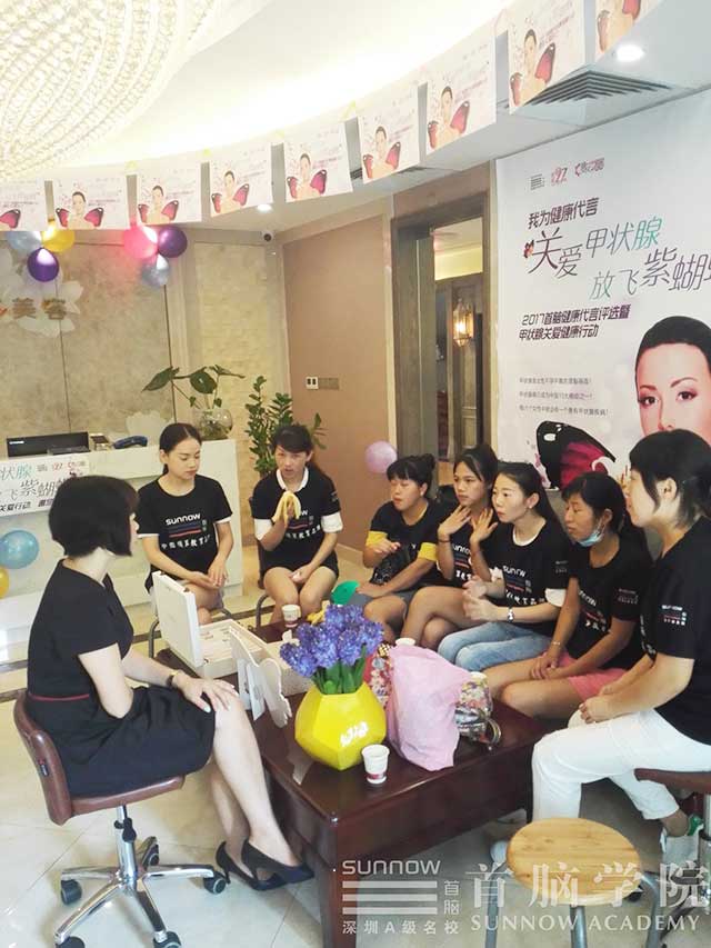 店鋪經(jīng)理帶同學(xué)們進(jìn)入美容護(hù)理室現(xiàn)場(chǎng)聆聽(tīng)專業(yè)心得的分享。經(jīng)理和美容師親自給同學(xué)們講解儀器知識(shí),這里的前輩講課好嚴(yán)謹(jǐn),每一個(gè)要緊的細(xì)節(jié)都跟同學(xué)們認(rèn)真的強(qiáng)調(diào),這趟觀摩讓同學(xué)們學(xué)到了不少真本事。提前熟悉高端美容儀器,接觸社會(huì)最前沿的美業(yè)知識(shí),從首腦學(xué)院畢業(yè),你已經(jīng)是社會(huì)最需要的人才。