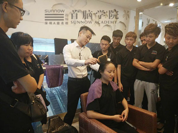 當(dāng)杜店長需要模特做示范的時候,學(xué)員們也是積極的報名,這是他們第一次觀摩,難免也是會有些小興奮的。杜店長邊做示范邊解說,學(xué)員們站在旁邊認(rèn)真地聽著。