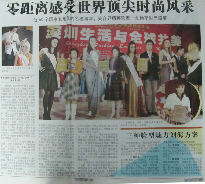 2007年12月8日至12日在山西舉辦“第19屆世界模特小姐大賽國(guó)際總決賽”深圳市首腦美容美發(fā)連鎖機(jī)構(gòu),再次被世界模特小姐大賽組委會(huì)特邀為“第19屆世界模特小姐大賽”山西、運(yùn)城大賽總決賽,唯一指定化妝造型單位,深圳市首腦美容美發(fā)培訓(xùn)學(xué)校 深圳市A級(jí)美容美發(fā)學(xué)校,形象設(shè)計(jì)班19位專業(yè)化妝師為整個(gè)大賽造型、化妝等;化妝師們將同來自世界五大洲約50多個(gè)國(guó)家和地區(qū)的佳麗云集運(yùn)城,一展風(fēng)采。以下為出發(fā)前及大賽中與佳麗們合影的精彩照片;