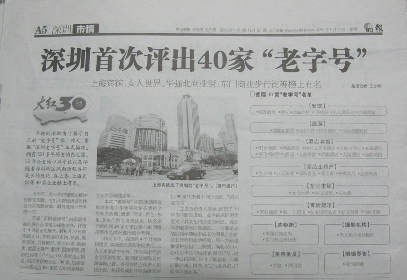昨天下午,在歷經(jīng)4個(gè)月的申報(bào)提名、實(shí)地走訪及網(wǎng)絡(luò)投票后,主辦方邀請政府領(lǐng)導(dǎo)、國內(nèi)知名經(jīng)濟(jì)企業(yè)管理專家、新聞媒體領(lǐng)導(dǎo)及資深編輯記者、各相關(guān)協(xié)會(huì)負(fù)責(zé)人擔(dān)任評(píng)委,共同組成的評(píng)審會(huì)隆重評(píng)出40家代表著不同行業(yè)的“深圳老字號(hào)”。