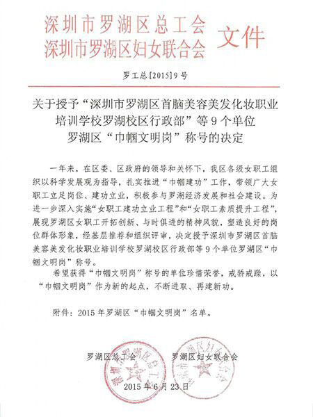 近日,深圳市羅湖區(qū)首腦美容美發(fā)化妝職業(yè)培訓(xùn)學(xué)校被區(qū)總工會、區(qū)婦聯(lián)授予羅湖區(qū)“巾幗文明崗”稱號,這是對首腦學(xué)院羅湖校區(qū)在針對女性方面所做工作的充分肯定。