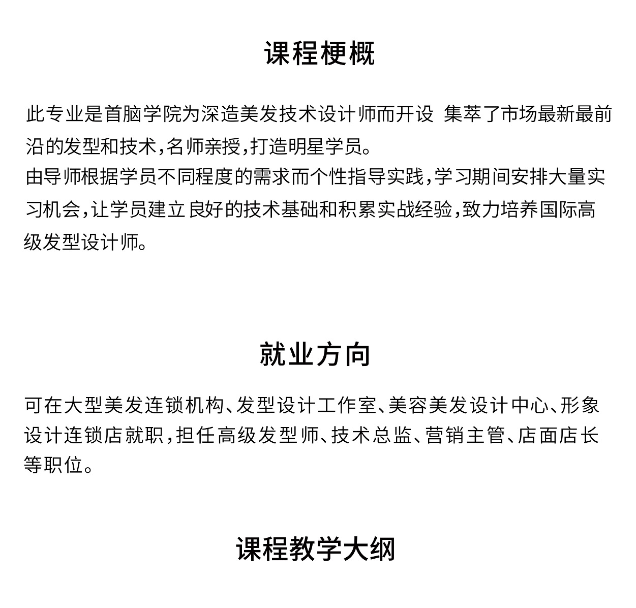 此專業(yè)是首腦學(xué)院為深造美發(fā)技術(shù)設(shè)計師而開設(shè)。集萃了市場最新最前沿的發(fā)型和技術(shù),名師親授,打造明星學(xué)員,由導(dǎo)師根據(jù)學(xué)員不同程度的需求而個性指導(dǎo)實踐,學(xué)習(xí)期間安排大量實習(xí)機會,讓學(xué)員建立良好的技術(shù)基礎(chǔ)和積累實戰(zhàn)經(jīng)驗,致力培養(yǎng)國際高級發(fā)型設(shè)計師