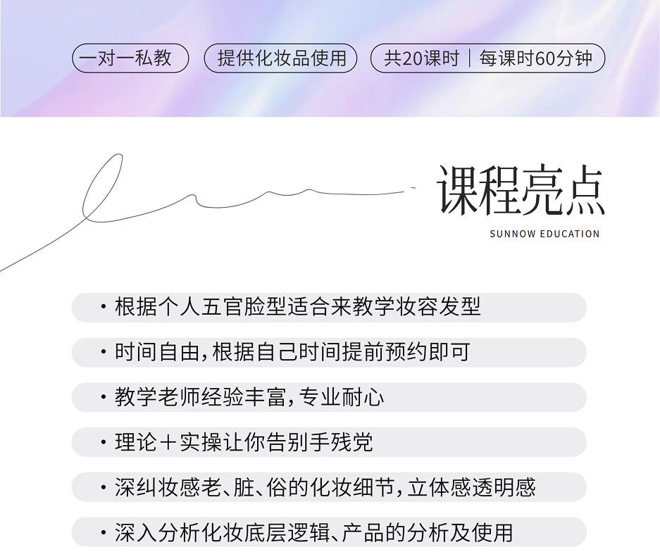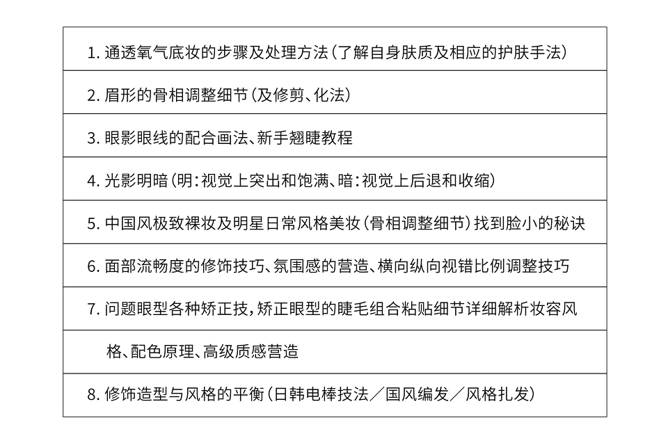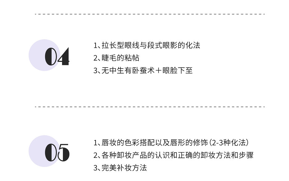 通過對日常生活所需妝面進行細致講解,教授更加流行的生活時尚妝容技巧。從五官分解的美學觀點進行剖析的基礎上,對修飾美容化妝、生活妝、職業(yè)妝、約會妝,名媛妝、時尚party妝等方面的化妝知識進行全方位傳授。