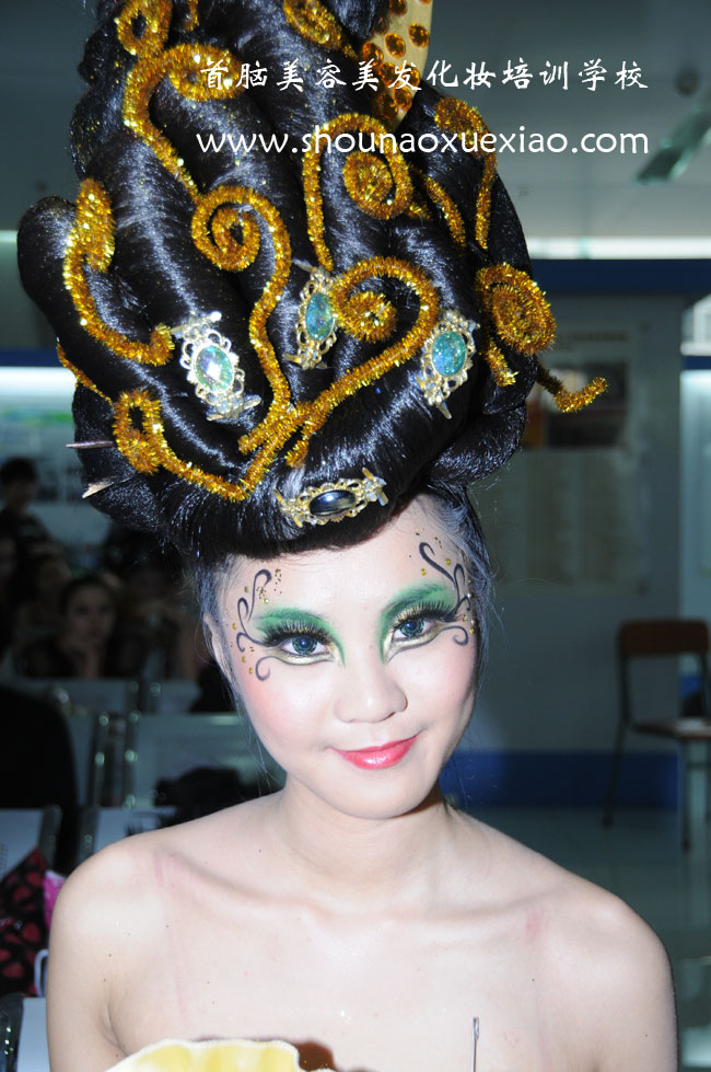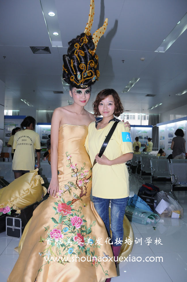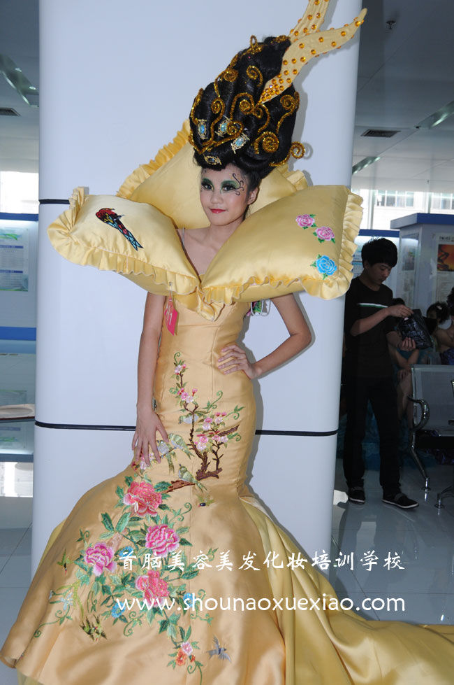 2010年11月20日,在深圳高訓(xùn)大廈一樓大廳,正在舉行2010年廣東省職業(yè)技能大賽深圳賽區(qū)美容美發(fā)化妝競(jìng)賽決賽。造型精美的模特一一走過(guò),承載著作者的殷切期望,熱情的、冷艷的、性感的、優(yōu)雅的風(fēng)格被一臉嚴(yán)肅的考評(píng)員一一審視,眾考評(píng)員毫無(wú)表情的為一個(gè)個(gè)的造型打著分?jǐn)?shù),忽然,眾人只覺(jué)眼前一亮,一個(gè)獨(dú)特的造型已款款而來(lái),華貴、大氣、高雅、自信……一種貴族氣質(zhì)撲面而來(lái),只見(jiàn)金黃色的長(zhǎng)裙上繡著國(guó)花牡丹,牡丹花的枝葉沿著模特誘人的曲線蜿蜒向上,雙肩上兩個(gè)獨(dú)特的造型正好像兩片綠葉一樣,映襯著臉上美麗的妝容,頭頂高高的黑色發(fā)髻上,點(diǎn)綴著金色的閃光花飾……