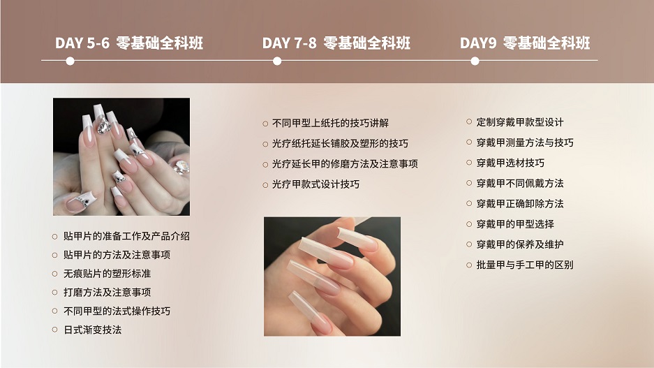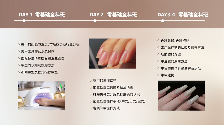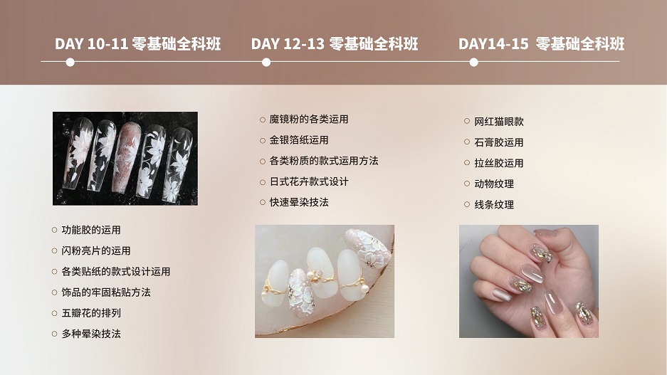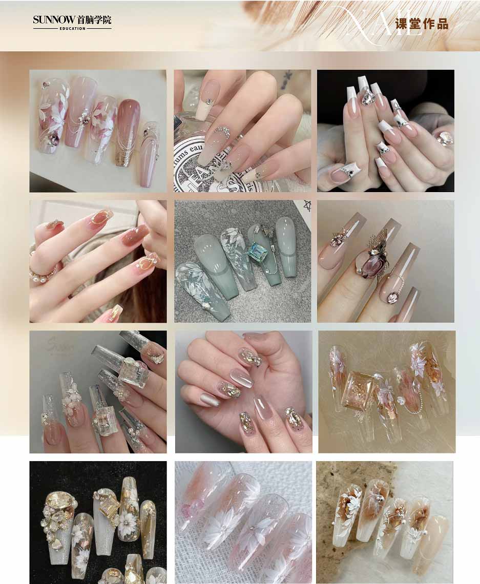 此課程是為塑造高級美甲師而開設的,從最基礎(chǔ)的自然甲護理/法式水晶/貼片甲/手部彩繪到儀器的使用。掌握扎實的美甲技術(shù),可以勝任美甲師的工作,也可以更好的發(fā)展自己的美甲事業(yè)。