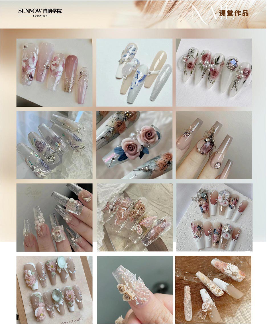 市場(chǎng)趨勢(shì)和行業(yè)分析 美甲工具和美甲產(chǎn)品的認(rèn)識(shí) 甲油膠、功能膠的認(rèn)識(shí)和使用,甲油膠的卸除 各種甲型的認(rèn)識(shí)和修飾(圓形,方形,尖形,圓尖形,方圓形,梯形等) 單色的涂刷,單層花卉(三瓣花、五瓣花、小雛菊) 點(diǎn)、線、面的運(yùn)用(棋盤格、格紋、蕾絲花紋、小香風(fēng)格紋的畫法) 漸變的技法(單色-雙色-三色-多色-閃粉漸變) 彩色泡泡款、多色鏤空款、愛心款、鉆石款、風(fēng)景椰樹、海灘風(fēng)景、海浪、波浪等繪畫技巧 日式暈染,日式大理石各種貼飾設(shè)計(jì)(金銀箔、彩箔、轉(zhuǎn)印化、貼紙等) 主題美甲設(shè)計(jì)(圣誕款、萬圣款、新年款、各種應(yīng)節(jié)款) 動(dòng)物紋理甲(豹紋、斑馬紋、老虎紋、奶牛紋) 各種創(chuàng)意法式,網(wǎng)紅款,當(dāng)季流行款 飾品和粘鉆(堆鉆、異形鉆、組合鉆) 貼片甲和光療甲(工具材料的認(rèn)識(shí)、操作技巧和注意事項(xiàng),卸除) 本甲建構(gòu) 穿戴甲 新中式水彩美甲運(yùn)用和款式制作