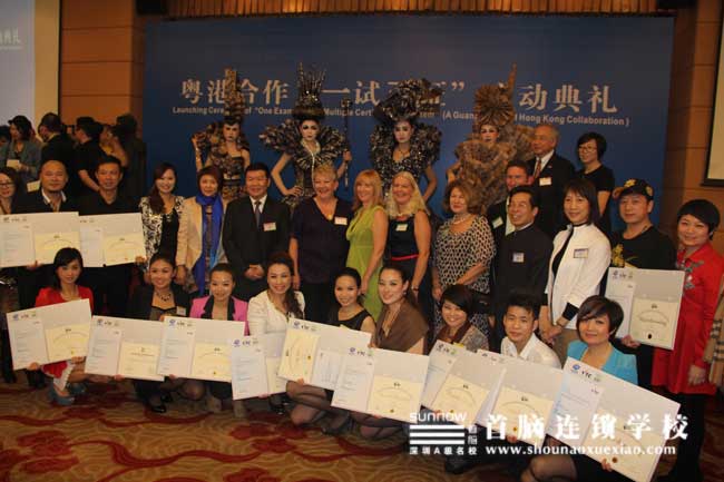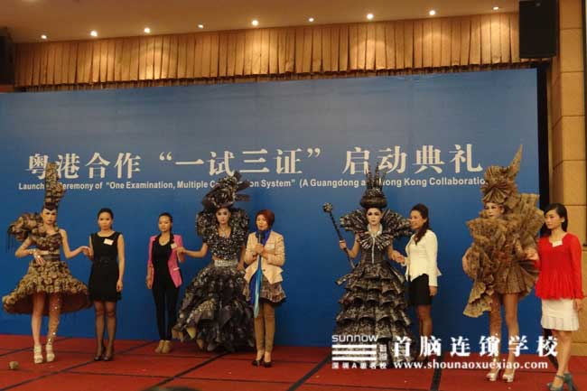 啟動(dòng)典禮儀式上,歐真志廳長、陳真仁主席、Jeanette Allen女士及省職業(yè)技能鑒定指導(dǎo)中心陳銳彬主任、香港職訓(xùn)局尤曾家麗執(zhí)行干事、香港職訓(xùn)局高級助理執(zhí)行干事梁協(xié)雄博士、香港美容美發(fā)業(yè)商會(huì)趙振國會(huì)長、CMIM撮箕集團(tuán)主席鄭明明等與會(huì)領(lǐng)導(dǎo)和嘉賓向獲得首批“一試三證”的大陸及香港的44名美容師、美發(fā)師考生(其中深圳考生22名,香港考生22名)頒發(fā)了證書。深圳首腦美容美發(fā)化妝連鎖學(xué)校獲得一試三證的考生應(yīng)邀在現(xiàn)場表演了大型國際時(shí)尚主題藝術(shù)造型秀,立意高深、設(shè)計(jì)新穎、制作精湛的造型作品,贏得了國際業(yè)界大師們的一直肯定和高度評價(jià)。“一試三證”專家委員會(huì)成員、首腦學(xué)??傂iL高穎女士介紹了首腦學(xué)校受托承擔(dān)一試三證項(xiàng)目試點(diǎn)開發(fā)的工作開展情況,并對考生們展示的作品進(jìn)行了深入淺出的闡釋與點(diǎn)評。
